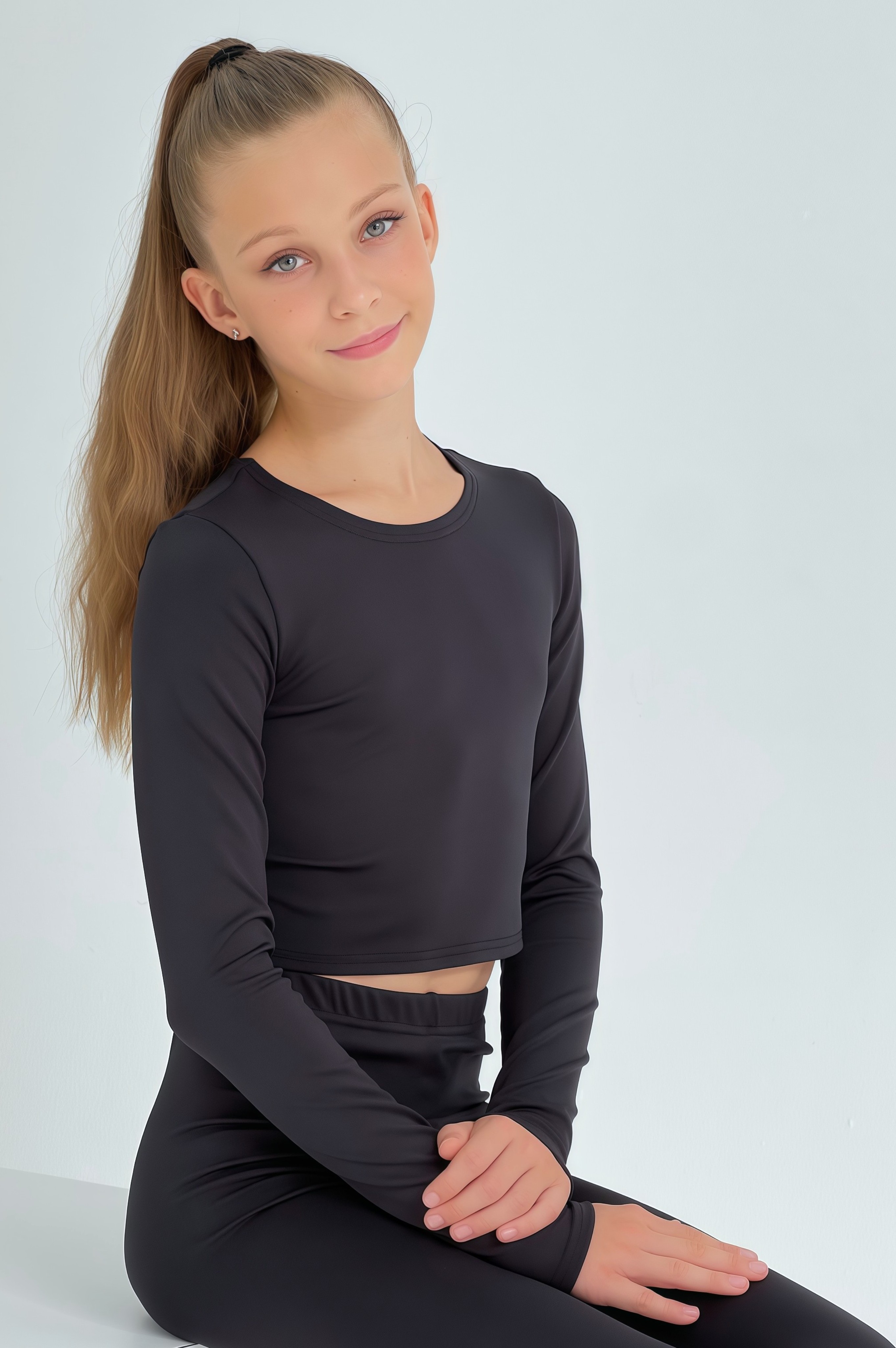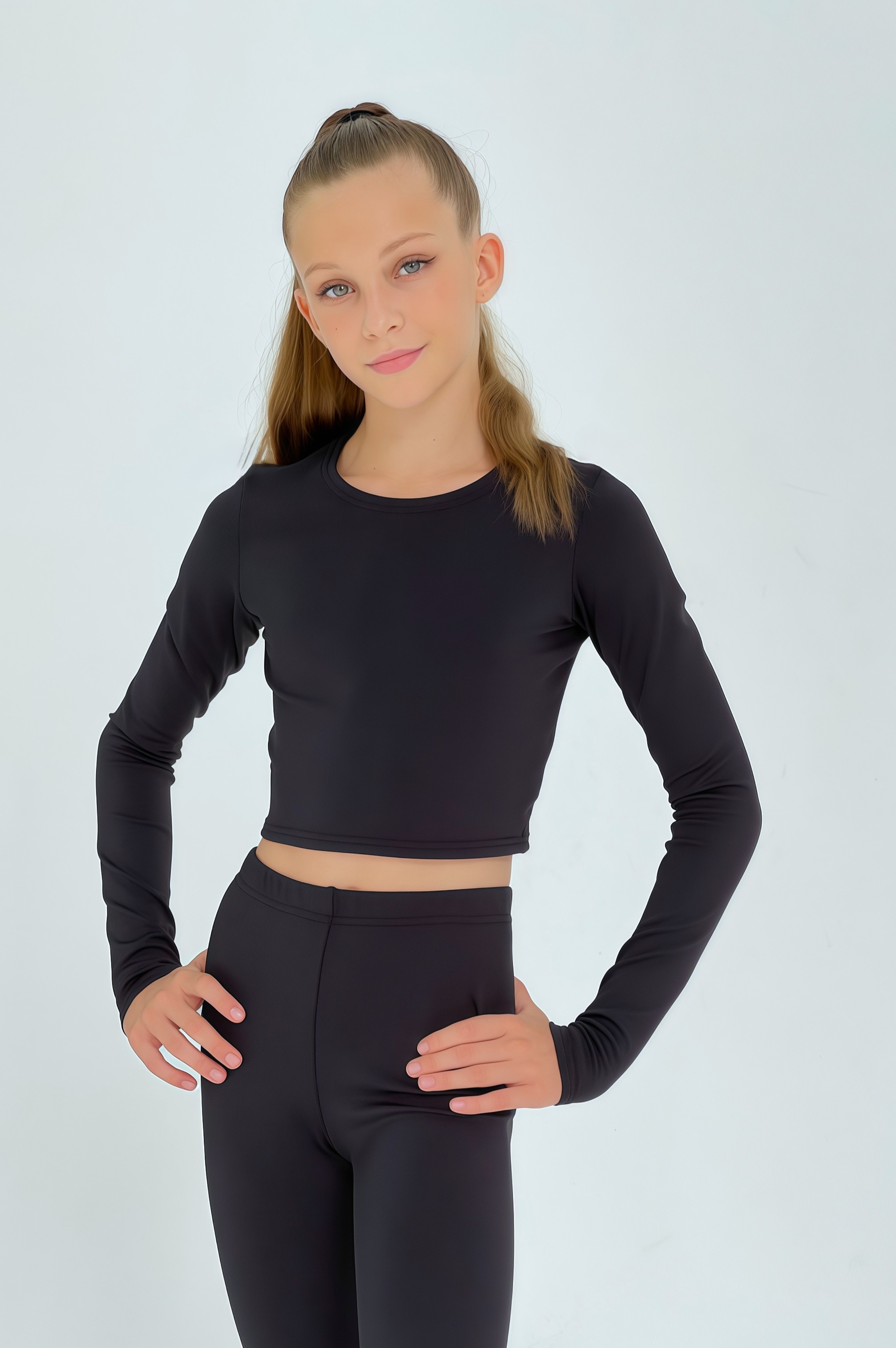 Стильный черный кроп-топ из серии "Магия черного" для девочки с длинным рукавом - базовая вещь в гардеробе любой спортсменки, танцовщицы или балерины.
