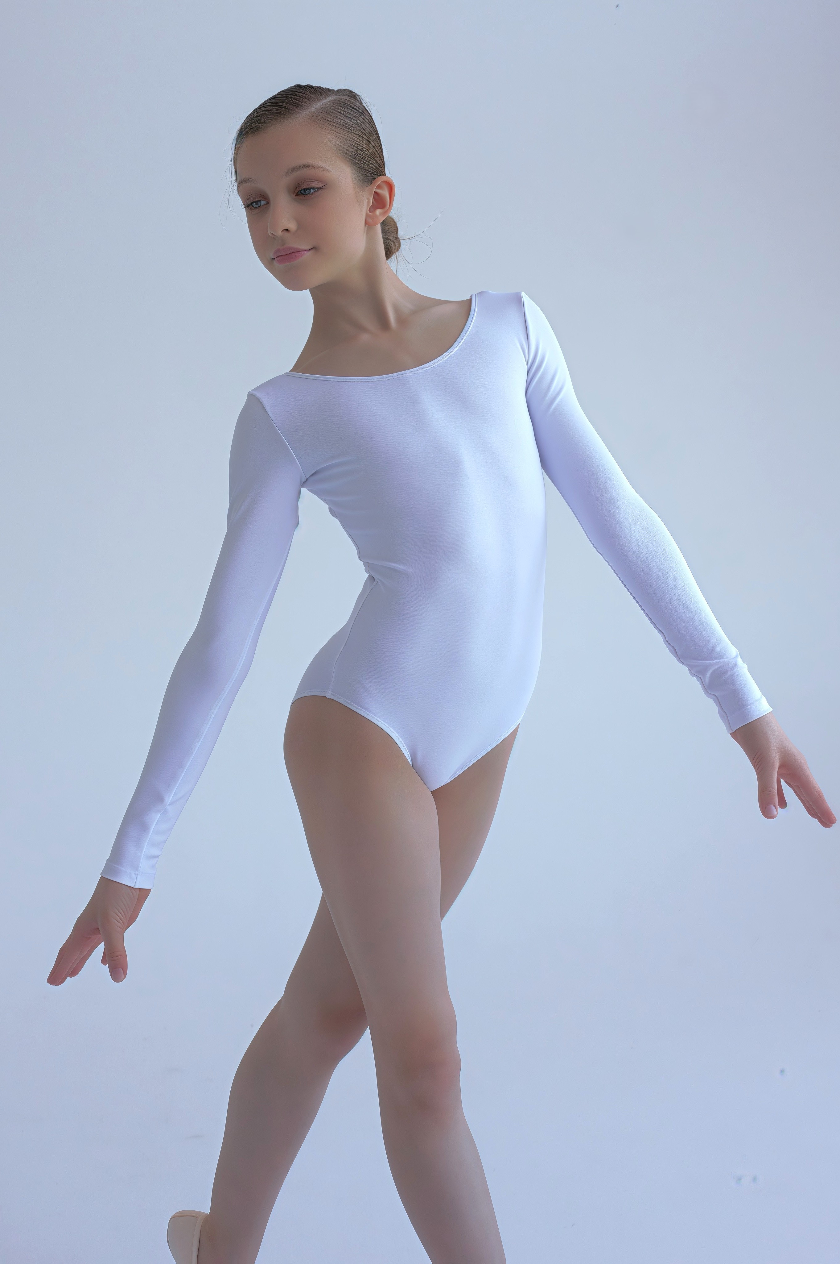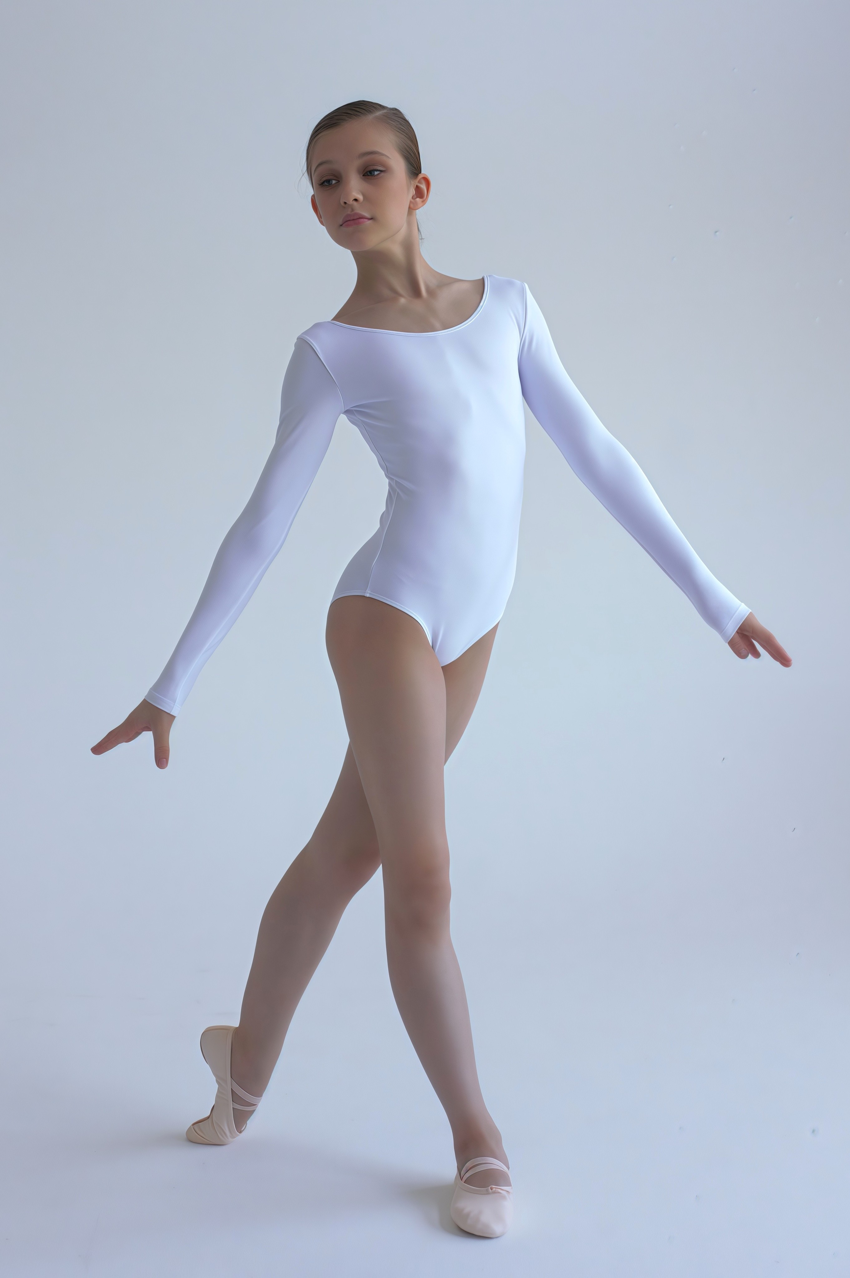Базовый купальник с длинным рукавами белого цвета. Подойдёт для занятий балетом, классической хореографией, латиной, народными и современными танцами. Для репетиций и выступлений.
